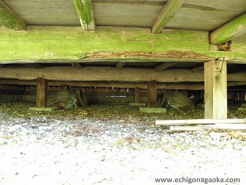 There are many Noh stages in Sado. It is said that there had been 200 of Noh stage, however, 32 remain as of 2010 1). Although most of Noh stages are properties of shrine or temple, this Homma’s Noh Stage is the only one that is a personal property 2). As shown in Photo.81.2, two pots are half buried with angles under to floor of the stage. This is to make acoustic effects of the sound.